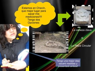 El documento presenta dos resúmenes de mediciones de ángulos realizadas en el sitio arqueológico de Chavín en Perú. En la primera sección, la autora mide el ángulo de elevación de una cabeza clava encontrando que su altura era de aproximadamente 2 metros. En la segunda sección, mide el ángulo de depresión desde el templo del Lanzón Monolítico hasta la plaza circular, encontrando una altura de aproximadamente 3.7 metros entre ambos puntos. El documento sugiere que estas mediciones proporcion