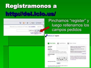 Del.icio.us es un servicio web gratuito para compartir y organizar marcadores o enlaces web. Los usuarios pueden registrarse en el sitio web de Del.icio.us, guardar enlaces de páginas que les gustan y asignarles etiquetas o "tags". Esto les permite a ellos y a otros usuarios encontrar y acceder a esos enlaces fácilmente. Del.icio.us también permite a los usuarios crear redes sociales siguiendo los enlaces de amigos, agrupar etiquetas en carpetas y compartir sus enlaces