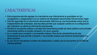 Delicious es un servicio web que permite a los usuarios guardar, organizar y compartir sus marcadores o enlaces favoritos mediante la asignación de etiquetas ("tags"). Los usuarios pueden almacenar enlaces privadamente o compartirlos públicamente con otros usuarios de Delicious. El servicio ofrece una interfaz sencilla y también permite la sindicación de contenido y el desarrollo de aplicaciones a través de una API.