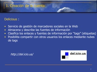 Delicious es un servicio que permite a los usuarios almacenar, organizar y compartir enlaces de la web. Los usuarios pueden clasificar enlaces con etiquetas y acceder a sus cuentas para registrar enlaces favoritos y suscribirse a etiquetas de otros usuarios. Delicious genera código de etiquetas para que los usuarios puedan compartir enlaces etiquetados.