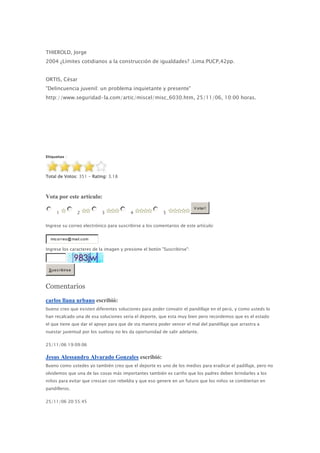 El documento discute las consecuencias negativas de la delincuencia juvenil y posibles soluciones como apoyo psicológico a las familias, centros de rehabilitación y trabajo comunitario. También propone el deporte como una forma saludable de rehabilitación que brinda desarrollo físico y emocional a los jóvenes.
