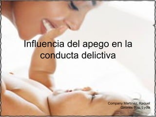 Este documento analiza cómo el tipo de apego desde el nacimiento puede influir en el desarrollo de una conducta delictiva. Explica que un apego inseguro se ha relacionado con un mayor riesgo de delincuencia debido a la insatisfacción de necesidades afectivas. Sin embargo, algunas personas con apego inseguro desarrollan resiliencia y no incurren en conductas delictivas. La familia también juega un papel importante como agente de socialización y puede facilitar comportamientos delictivos si existe poca supervisión y