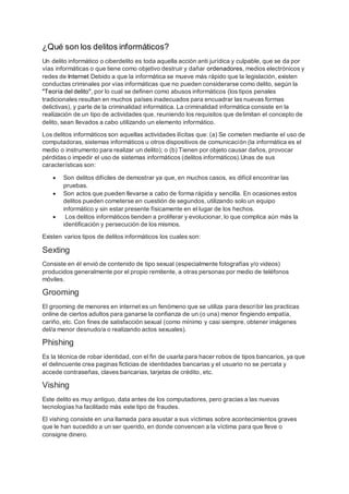 Los delitos informáticos son actividades ilícitas que se cometen mediante el uso de computadoras o sistemas informáticos, o que tienen como objetivo dañar estos sistemas. Algunos ejemplos son el sexting, grooming, phishing, vishing y pharming, que incluyen el robo de identidad y datos personales. Los delitos informáticos son difíciles de detectar y probar debido a que a menudo ocurren en línea y sin presencia física. La ley colombiana tipifica varios delitos informáticos