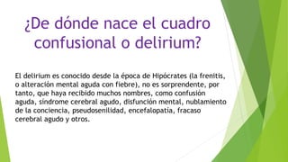 El documento habla sobre el cuadro confusional o delirium. Se define como un cuadro mental agudo que afecta la conciencia, las funciones cognitivas y se desarrolla rápidamente en horas o días. Las causas más comunes incluyen infecciones, intoxicaciones, hipoxemia, cirugías y deprivación sensorial. Los síntomas fluctúan e incluyen desorganización del pensamiento, deterioro de la memoria, falsas percepciones y alteración del sueño. El tratamiento se enfoca en corregir la causa subyacente y mejorar el