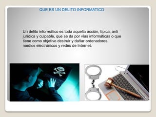Un delito informático es cualquier acción ilegal, intencional y culpable que se lleva a cabo a través de medios informáticos o que tiene como objetivo dañar computadoras, dispositivos electrónicos o redes de Internet. Los delitos informáticos en Colombia están protegidos por la Constitución y pueden incluir falsificación informática o fraude informático. Las leyes como el Habeas Data, la Ley SOPA y la Ley Lleras buscan regular los delitos informáticos y proteger los derechos de los ciudadanos.
