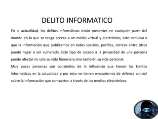 Los delitos informáticos son una amenaza global que afecta la privacidad y la seguridad financiera de las personas en el entorno digital. Incluyen conductas como el sabotaje informático, la piratería, el robo de identidad y el phreaking, y pueden ser motivados por razones económicas o el deseo de demostrar habilidades. En Venezuela, la ley especial contra los delitos informáticos de 2001 es la principal normativa que regula estas actividades delictivas.