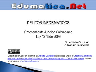 Este documento describe los delitos informáticos según la ley colombiana. Define delitos como acceso abusivo a sistemas, daño informático, violación de datos personales, y establece sanciones como multas y penas de prisión de 36 a 120 meses por cometer este tipo de crímenes. También analiza virus informáticos, métodos de protección, y tipos de infracciones que no constituyen delitos pero pueden ser problemáticos.