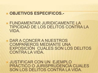 Este documento resume los principales delitos contra la vida tipificados en el Código Penal Ecuatoriano, incluyendo el asesinato, homicidio, suicidio, aborto y aborto letal. Define cada delito, establece las penas correspondientes y circunstancias modificatorias. El objetivo es dar a conocer estos delitos a estudiantes de derecho y justificarlos con ejemplos prácticos.