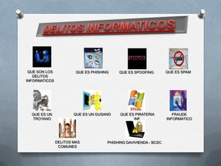 El documento resume varios tipos de delitos informáticos como phishing, spoofing, spam, troyanos, gusanos, piratería informática y fraude informático. También menciona algunos de los delitos más comunes como el envío de spam, phishing para robar información bancaria, y el uso de troyanos y gusanos para controlar sistemas y robar datos. Por último, habla sobre un nuevo sistema de seguridad que implementa el banco BCSC para proteger a los usuarios.