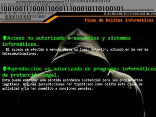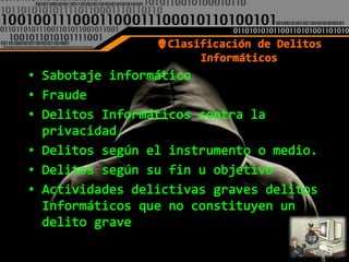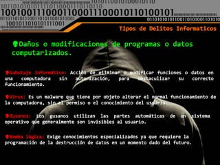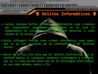 El documento define el delito informático como aquel que involucra el uso de computadoras ya sea como objeto o medio para cometer un crimen, según Carlos Sarzana. Nidia Callegari también lo define como un crimen que se comete con la ayuda de la informática o técnicas relacionadas. Finalmente, María de la Luz Lima considera que un delito electrónico es cualquier conducta criminal que hace uso de la tecnología electrónica como método, medio o fin.