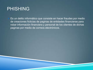 Este documento describe varios tipos de delitos informáticos como el phishing, que implica el fraude a través de páginas web falsas para robar información financiera y personal; el spam, que son correos electrónicos no deseados; y los troyanos y gusanos, que son programas maliciosos que dañan archivos y roban información.