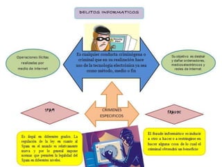 El documento discute dos definiciones de delitos informáticos. Julio Tellez Valdez los define como actos ilícitos que usan computadoras como instrumento o fin, mientras que Carlos Sarzana los define más ampliamente como cualquier comportamiento criminal relacionado con computadoras.