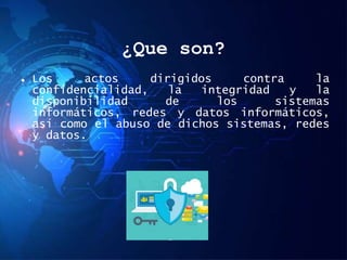 El documento describe los delitos informáticos, cómo se establecieron normas internacionales para enfrentarlos en el Convenio de Budapest de 2001, y cómo se tipificaron en la legislación colombiana. Explica que los delitos informáticos atentan contra la confidencialidad, integridad y disponibilidad de sistemas y datos, pueden cometerse de forma remota y rápida, y son difíciles de demostrar. El convenio define cuatro categorías de delitos y establece normas de cooperación internacional e investigación.