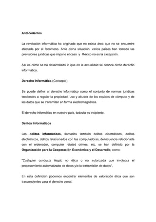 Este documento trata sobre los delitos informáticos y electrónicos. Explica que con el avance de la tecnología, el derecho se ha visto afectado y ha habido una necesidad de regular nuevos delitos como la manipulación de datos y sistemas informáticos. Define los delitos informáticos y electrónicos y explica que pueden involucrar actos como robo, fraude o sabotaje cometido a través de computadoras. También clasifica y describe a los sujetos de estos delitos y sus modalidades.