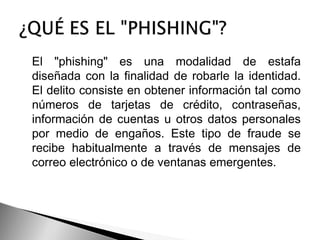 El documento habla sobre el "phishing", un tipo de fraude en el que los criminales envían mensajes falsos diseñados para parecer legítimos con el fin de robar información personal como números de tarjetas de crédito y contraseñas. Estos mensajes suelen incluir enlaces a sitios web falsos donde se solicita dicha información de manera engañosa. Se recomienda no responder a este tipo de solicitudes y estar alerta ante posibles fraudes.