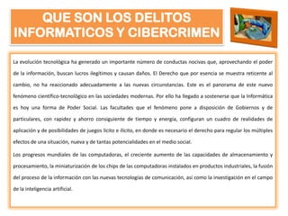 El documento trata sobre los orígenes y tipos de delitos informáticos. Explica que los delitos informáticos surgen del uso indebido de la tecnología y la información para fines ilícitos como lucro o daño. Describe dos categorías de delitos informáticos: aquellos donde la computadora es el instrumento del delito, y aquellos donde es el objetivo. También diferencia entre delitos informáticos y delitos computacionales.