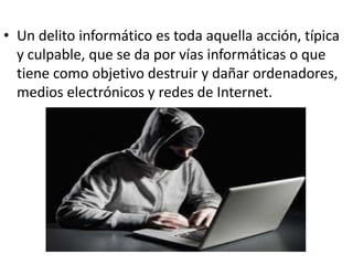 Este documento describe los delitos informáticos y cómo se dividen en dos grupos: crímenes que tienen como objetivo redes de computadoras y crímenes realizados por medio de ordenadores e Internet, como fraude, robo de información, daños a sistemas y redes. También menciona actividades ilegales comunes como el ingreso no autorizado a sistemas, interceptación de redes y chantaje electrónico.