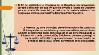 La ley de delitos informáticos sanciona con hasta 8 años de prisión el acoso sexual infantil por internet y otros ilícitos. Expertos señalan que algunos artículos podrían vulnerar la libertad de expresión y prensa. Sin embargo, el gobierno indica que la ley busca proteger a las personas de hackers y la violación a comunicaciones privadas. Críticos argumentan que los tipos penales son demasiado abiertos y podrían afectar derechos.