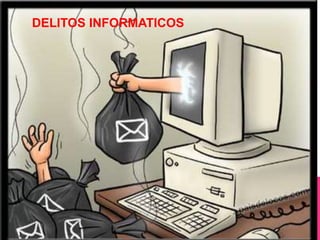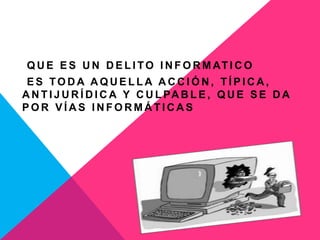 Este documento define los delitos informáticos como acciones típicas, antijurídicas y culpables que se cometen por vías informáticas y tienen como objetivo destruir y dañar equipos electrónicos y redes. Incluye una amplia variedad de crímenes como fraude, contenido obsceno, acoso cibernético, tráfico de drogas, terrorismo virtual y más. En Colombia, la ley 1273 de 2009 creó un nuevo bien jurídico para proteger la información y datos, y preservar los sistemas de tecnología.