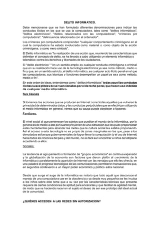 El documento aborda el concepto de delitos informáticos, que incluyen diversas conductas ilícitas en las que intervienen computadoras y tecnología electrónica. Se analizan las causas, características de los delincuentes y víctimas, así como los tipos de delitos más comunes y sus consecuencias en la sociedad. Además, se destaca la necesidad de medidas de protección y educación para prevenir estos crímenes, así como la importancia de denunciar para mejorar las estadísticas y la respuesta legal ante estos ilícitos.