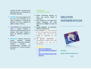 Este documento define los delitos informáticos como actividades ilícitas cometidas mediante dispositivos de comunicación con el objetivo de causar daños o impedir el uso de sistemas. En Colombia, la Ley 1273 de 2009 castiga estos delitos con penas de prisión de hasta 120 meses y multas. Algunos delitos informáticos comunes son el hacking, virus informáticos, grooming y ciberacoso. El documento también proporciona consejos sobre cómo protegerse de estos delitos.
