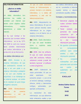 Este documento define los delitos informáticos como acciones cometidas por internet para dañar computadoras, dispositivos electrónicos y redes. La ley 1273 de 2009 estableció nuevos delitos informáticos y protege la información. Algunos delitos informáticos son acceder sin autorización a sistemas, obstaculizar sistemas o redes, interpretar datos sin orden judicial, borrar datos sin permiso y traficar software ilegalmente. El documento recomienda denunciar páginas que cometen delitos informáticos y no compart