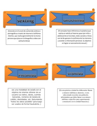 El documento define varios tipos de delitos informáticos como el sexting, grooming, phishing, vishing y spoofing. Explica que el daño informático implica eliminar, dañar o alterar información de un sistema sin autorización. También advierte sobre cómo evitar ser víctima de estafas al no proporcionar datos personales o bancarios en línea sin antes verificar la legitimidad de la solicitud. Finalmente, resume las leyes colombianas como la Ley 1273/09 que castigan delitos como la violación de datos personales.