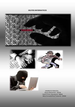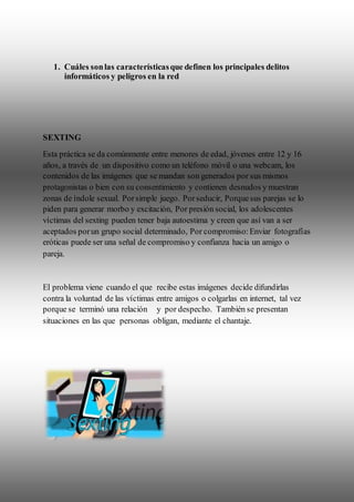 Este documento describe varios delitos informáticos comunes como el sexting, grooming, phishing, vishing, pharming, ciberacoso y malware. Explica las características de cada uno y sus consecuencias legales. También proporciona recomendaciones para protegerse como configurar privacidad en redes sociales, no proveer información personal en línea y no guardar contraseñas en computadoras públicas.