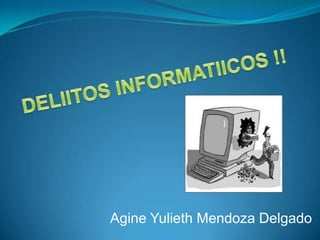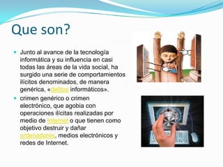 Este documento describe los delitos informáticos, que son comportamientos ilícitos realizados a través de Internet o que tienen como objetivo dañar computadoras, medios electrónicos y redes. Incluye tipos como sabotaje informático, fraude a través de computadoras, y delitos contra la privacidad. También menciona ejemplos como estafas electrónicas, piratería de software y espionaje informático. Finalmente, insta a denunciar estos delitos ante la unidad policial correspondiente.