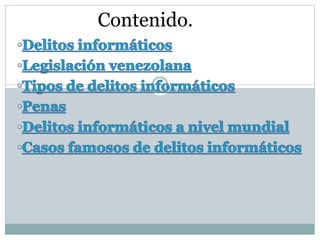 Este documento describe los delitos informáticos según la legislación venezolana. Explica los tipos de delitos informáticos como acceso indebido, sabotaje, hurto, fraude y violación de privacidad. También resume casos famosos de delitos informáticos cometidos por hackers como Richard Stallman, David Smith, Robert Morris y Vladimir Levin.