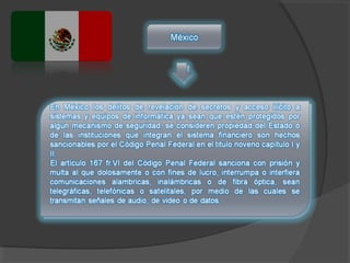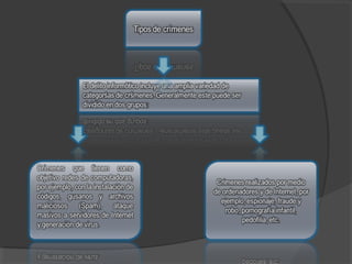 El documento describe varios tipos de delitos informáticos, incluyendo la propagación de virus, spam, fraude, contenido obsceno, acoso cibernético, tráfico de drogas, terrorismo virtual y pedofilia. También discute los desafíos de establecer marcos legales para estos crímenes que a menudo cruzan fronteras nacionales.
