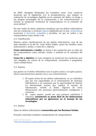 Este documento trata sobre los delitos informáticos. Define los delitos informáticos como conductas antijurídicas que utilizan computadoras como medio o fin. Clasifica los delitos informáticos en dos categorías: como instrumento o medio, y como fin u objetivo. También describe los sujetos de estos delitos, tipos de delitos informáticos reconocidos a nivel internacional como fraude, falsificación, daños a sistemas, y comparte ejemplos de legislación sobre delitos informáticos en varios países.