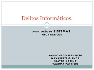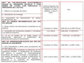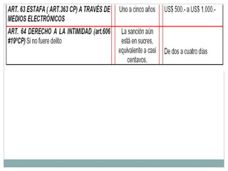 Este documento define los delitos informáticos y describe varios tipos, incluyendo fraude cometido mediante manipulación de computadoras, falsificaciones informáticas y daños o modificaciones de programas o datos computarizados. También explica términos como pirata, hacker y cracker, e identifica infracciones contempladas en la ley ecuatoriana como la violación de la confidencialidad de información y la responsabilidad de los funcionarios públicos de proteger la información.