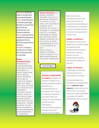 El documento habla sobre los delitos informáticos. Explica que son acciones ilegales que dañan o destruyen computadoras, dispositivos electrónicos o redes de internet. Luego describe algunos tipos de delitos informáticos como acceso ilícito a sistemas, interceptación de datos, interferencia en sistemas e información falsa. Finalmente, menciona la ley colombiana de 2009 que castiga estos delitos con penas de prisión y multas.