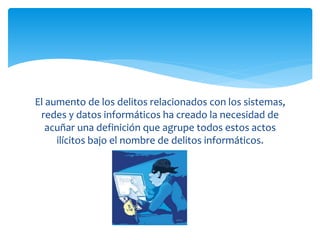 Este documento describe los delitos informáticos y la ley colombiana relacionada. Explica que los delitos informáticos incluyen acciones como el acceso ilícito a sistemas, la interceptación de datos y la interferencia con sistemas. También describe cuatro tipos principales de delitos informáticos según la ley colombiana y ofrece consejos sobre seguridad informática.