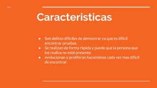 Los delitos informáticos son difíciles de demostrar y detectar debido a que a menudo no dejan pruebas y se pueden cometer de forma remota. Incluyen phishing, donde se roban datos personales mediante páginas falsas, y pharming, que redirecciona a usuarios a páginas fraudulentas. También existen delitos como sexting, grooming y malware, que comparten información o contenido sexual de menores, contactan con ellos con fines sexuales o dañan sistemas informáticos respectivamente.