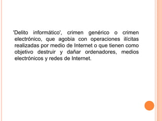Los delitos informáticos abarcan una amplia gama de crímenes realizados a través de Internet, incluyendo el fraude, robo, y daños a sistemas. Se dividen en crímenes que atacan redes de computadoras y aquellos que utilizan computadores para realizar delitos tradicionales. La evolución de la tecnología ha llevado a un aumento en la sofisticación y frecuencia de estas actividades delictivas, que pueden tener consecuencias graves aunque el daño no siempre sea físico.