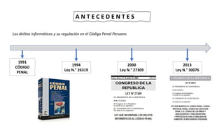 El documento describe la historia y regulación de los delitos informáticos en la legislación peruana. Se menciona leyes de 1991, 1994, 2000, 2013 y 2014 que trataron de regular estos delitos. La Ley N° 30096 de 2013 define el delito de acceso ilícito a sistemas informáticos y establece penas de 1 a 4 años de prisión. El documento también explica conceptos como cracking y vulneración de medidas de seguridad, e identifica a los sujetos pasivos y activos en estos delitos.