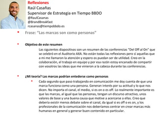 El documento presenta reflexiones sobre la evolución del marketing y la comunicación en la era digital, destacando que las marcas deberían ser tratadas como personas y centrarse en la creación de contenido atractivo. Se abordan cambios significativos en la metodología de trabajo, la importancia de la tecnología y la personalización en la comunicación, así como ejemplos de innovaciones y buenas prácticas en el sector. Además, se enfatiza la necesidad de adaptarse a las nuevas dinámicas del consumidor y el uso de plataformas digitales para optimizar la comunicación.
