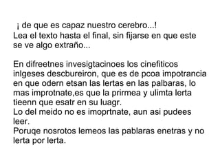 ¡ de que es capaz nuestro cerebro...! Lea el texto hasta el final, sin fijarse en que este se ve algo extraño... En difreetnes invesigtacinoes los cinefiticos inlgeses descbureiron, que es de pcoa impotrancia en que odern etsan las lertas en las palbaras, lo mas improtnate,es que la prirmea y ulimta lerta tieenn que esatr en su luagr.  Lo del meido no es imoprtnate, aun asi pudees leer. Poruqe nosrotos lemeos las pablaras enetras y no lerta por lerta.