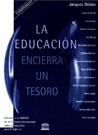El informe analiza los desafíos y oportunidades de la educación frente a los cambios globales y propone cuatro pilares fundamentales de la educación - aprender a conocer, aprender a hacer, aprender a vivir juntos y aprender a ser - para promover un desarrollo humano más armónico a través de la educación a lo largo de toda la vida.