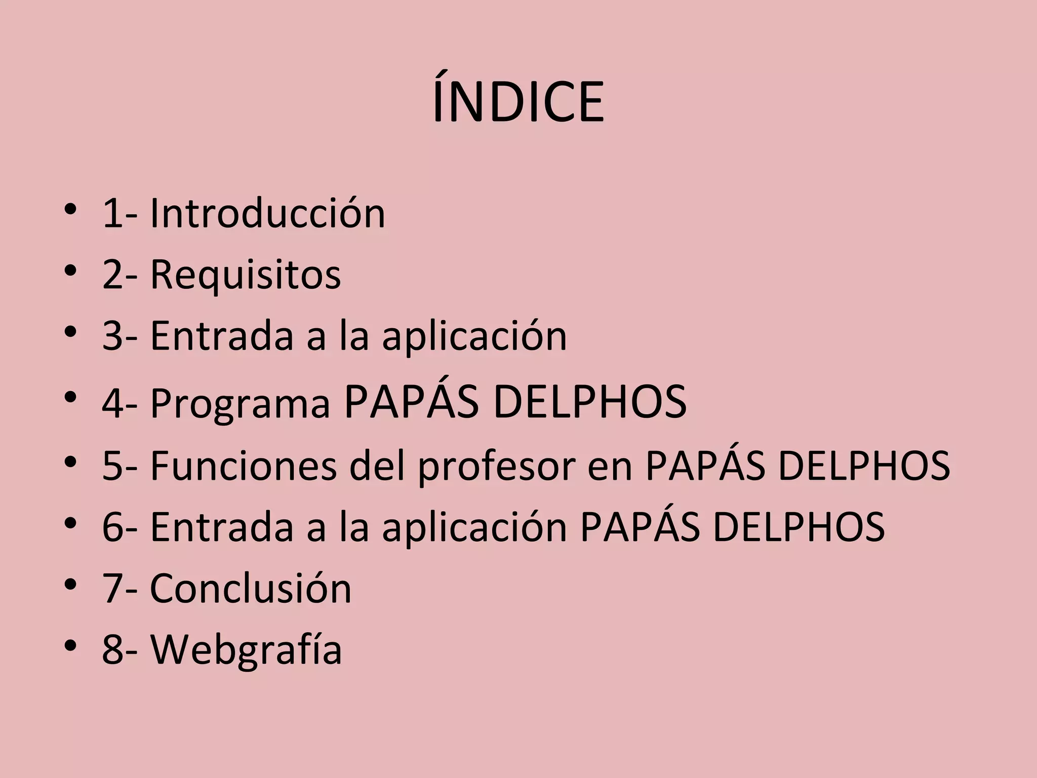 Este documento describe el programa PAPÁS DELPHOS, una aplicación diseñada para facilitar la gestión de centros educativos y mejorar la comunicación entre padres, profesores y equipo directivo. Explica que PAPÁS DELPHOS permite realizar tareas como control de asistencia, asignación de trabajos, comunicación con otros usuarios y seguimiento del rendimiento de los estudiantes. También identifica algunos retos como la falta de formación en TIC de las familias y profesores y la falta de comunicación entre estos grupos a pesar