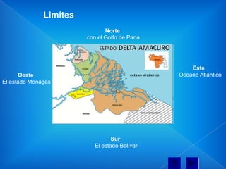 El estado Delta Amacuro se encuentra ubicado al noreste de Venezuela, limitando con el Golfo de Paria y el Océano Atlántico. Su capital es Tucupita. Las principales actividades económicas son la agricultura, ganadería y la industria petrolera. El folklore se caracteriza por las danzas y tradiciones de los pueblos indígenas Warao.