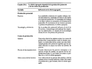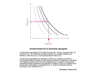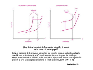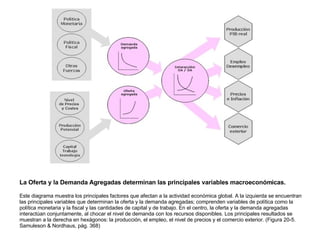 Este documento describe los conceptos de demanda agregada y oferta agregada, las cuales determinan las principales variables macroeconómicas. Explica que la demanda agregada depende del consumo, la inversión, el gasto público y las exportaciones netas, mientras que la oferta agregada depende de la producción potencial y los costos de los factores productivos. También distingue entre la curva de oferta agregada a corto plazo, que es más plana, y la curva a largo plazo, que es vertical.