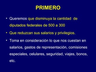 Este documento propone 10 medidas ciudadanas para reducir el gasto político en México, incluyendo reducir el número de legisladores, cancelar los seguros médicos privados de funcionarios públicos, recortar el presupuesto de los partidos políticos, eliminar los legisladores plurinominales, quitar el fuero y las pensiones vitalicias de los presidentes y funcionarios. Finalmente, pide a los ciudadanos difundir esta propuesta para que se escuche la voluntad del pueblo.