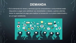 Este documento describe los conceptos fundamentales de la demanda de mercado, incluyendo sus tipos, cómo se representa y cómo se determina. Explica que la demanda depende de factores como las preferencias de los consumidores, sus ingresos y los precios de los bienes. También cubre la competencia perfecta e imperfecta entre la oferta y la demanda en el mercado.