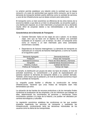 Este documento presenta una introducción a la teoría de la demanda de transporte urbano. Explica que la demanda de transporte depende de factores como el precio, el ingreso de los pasajeros, la velocidad y calidad del servicio. También introduce conceptos como la relación negativa entre precio y cantidad demandada, y el precio generalizado que incluye no solo el costo monetario sino también el valor del tiempo y otros factores cualitativos.