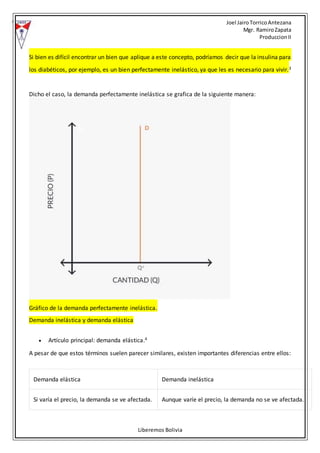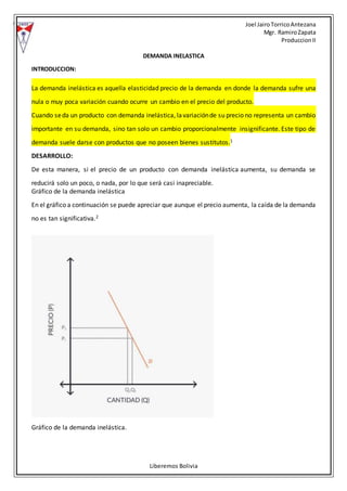 Este documento explica la demanda inelástica, que ocurre cuando pequeños cambios en el precio de un producto causan muy poca variación en la cantidad demandada. Los ejemplos de demanda inelástica incluyen productos de primera necesidad como el agua, medicamentos vitales e incluso cigarrillos. El documento también contrasta la demanda inelástica con la demanda elástica y provee gráficos para ilustrar ambos conceptos.