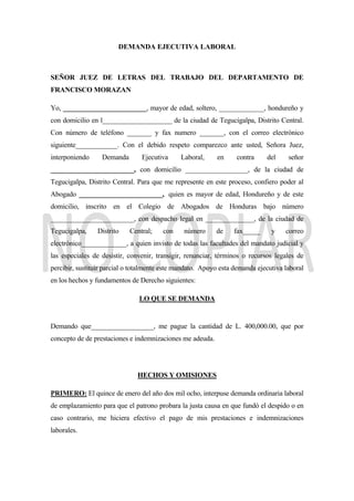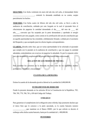 Este documento es una demanda ejecutiva laboral presentada ante un juez de letras del trabajo en Honduras. El demandante está solicitando el pago de L. 400,000.00 en concepto de prestaciones e indemnizaciones laborales adeudadas por el demandado. Según el documento, las partes llegaron a un acuerdo conciliatorio en una audiencia anterior en la que el demandado se comprometió a pagar dicha cantidad, pero no lo ha hecho. Por lo tanto, el demandante está solicitando al juez que decrete el embargo de la cuenta bancaria del