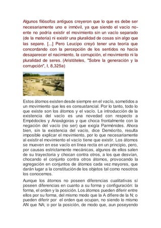 Demócrito fue un filósofo griego del siglo V a.C. nacido en Abdera que realizó numerosos viajes para estudiar teología, astrología y geometría. Fue discípulo de Leucipo y desarrolló la doctrina del atomismo, enseñando que todo está compuesto de átomos indivisibles que se mueven en el vacío. Demócrito creía que los átomos, que difieren en forma, tamaño y orden, se juntan y separan mecánicamente para formar los objetos que percibimos